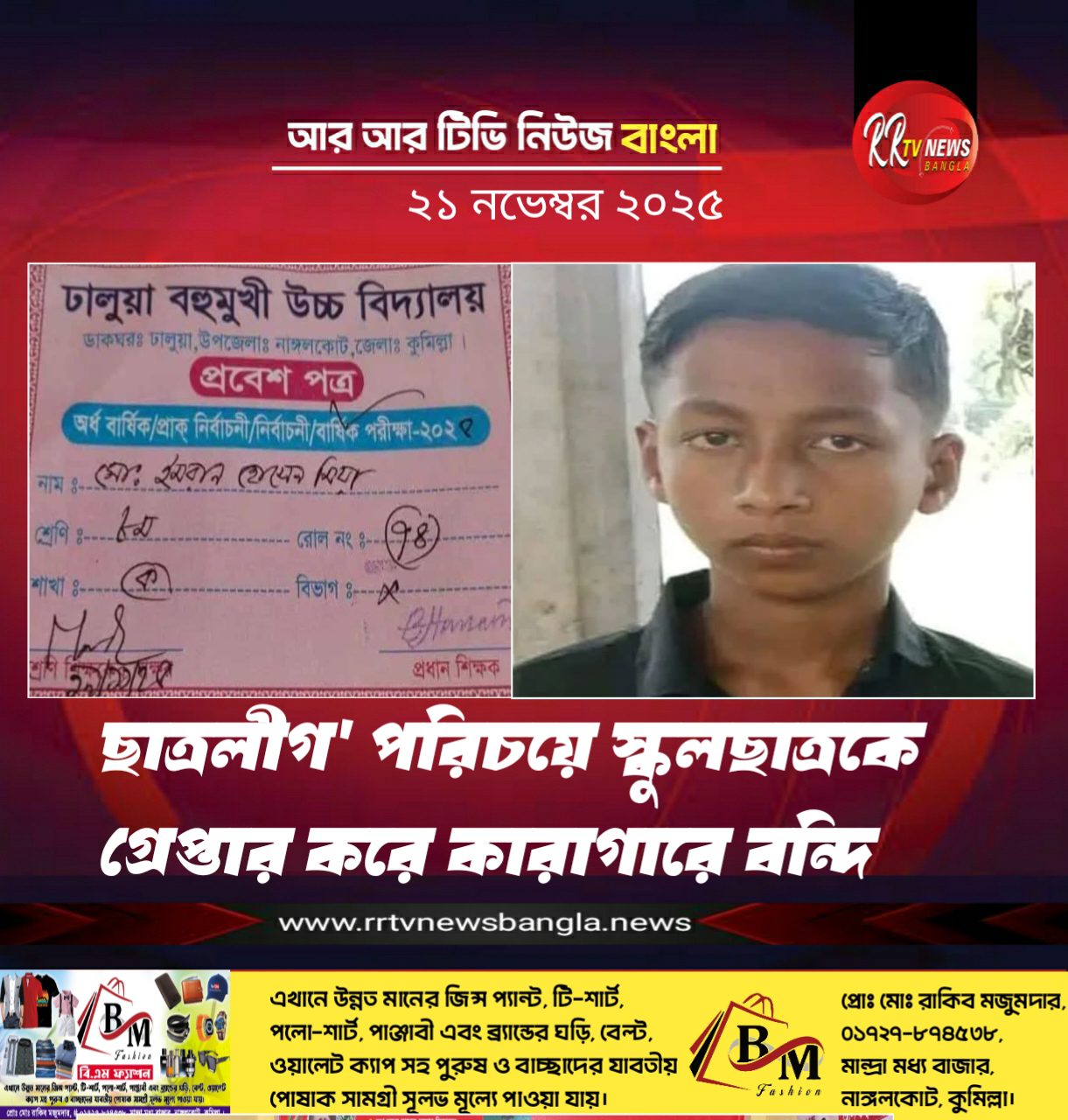 কুমিল্লায় ‘ছাত্রলীগ’ পরিচয়ে এক স্কুলছাত্রকে গ্রেপ্তার করে কারাগারে পাঠানো হয়েছে।