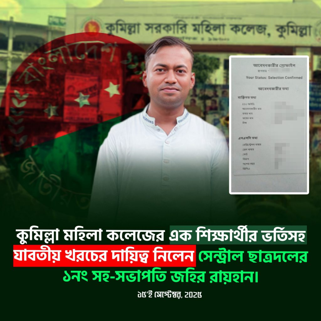 কুমিল্লা মহিলা কলেজে অসচ্ছল শিক্ষার্থীর ভর্তি ও খরচের দায়িত্ব নিলেন ছাত্রদল নেতা জহির রায়হান